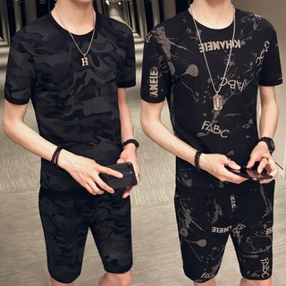 Streetwear Ropa De Hombre Summer Korea Style Clothes Mens T Shirts And Short 2 Pcs Set Personality Printed Mens Clothin