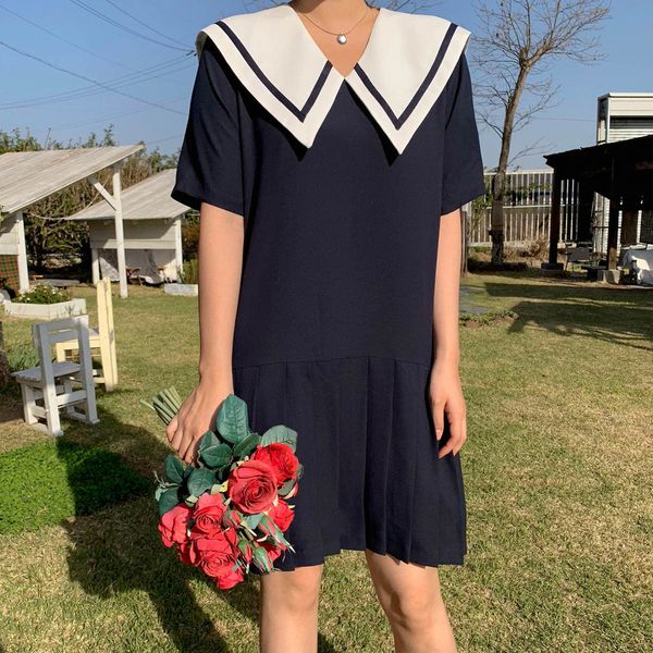 Navy Collar Splice Pleated Dress Blue Office Vintage Vestidos Verano 2019 Mini Cortos Vestido Casual Korean Style Women Sukienka Sale Black Dresses