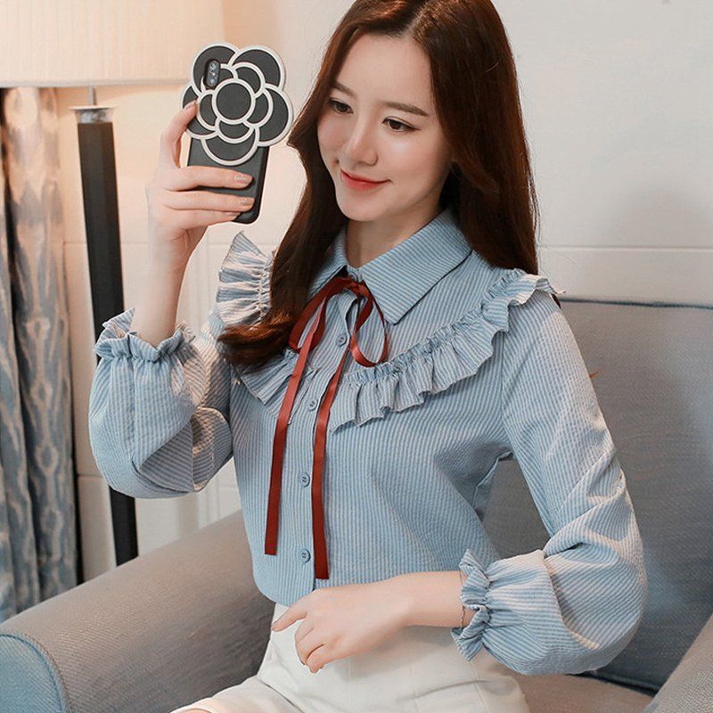 2019 Women S Shirts Ruffled Striped Blouses Womens Tops Elegant Long Sleeve Blusas Mujer 2019 Fashion Autumn Tops Women Camisa From Yan556 23 72