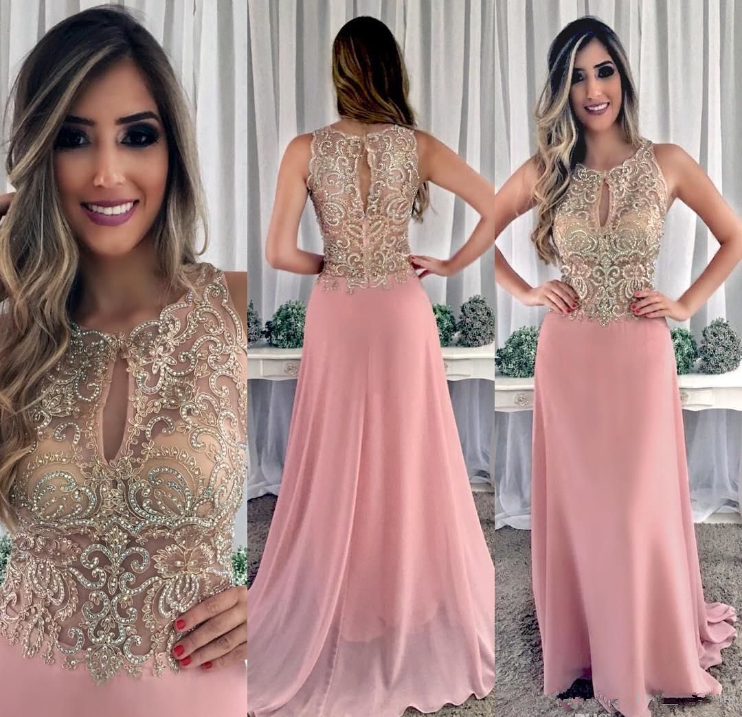 Compre Elegante Vestido De Noche De Color Rosa Formal 2019 Joya Sin Mangas Apliques De Encaje Con Cuentas Una Linea Fiesta Larga Fiesta De Graduacion