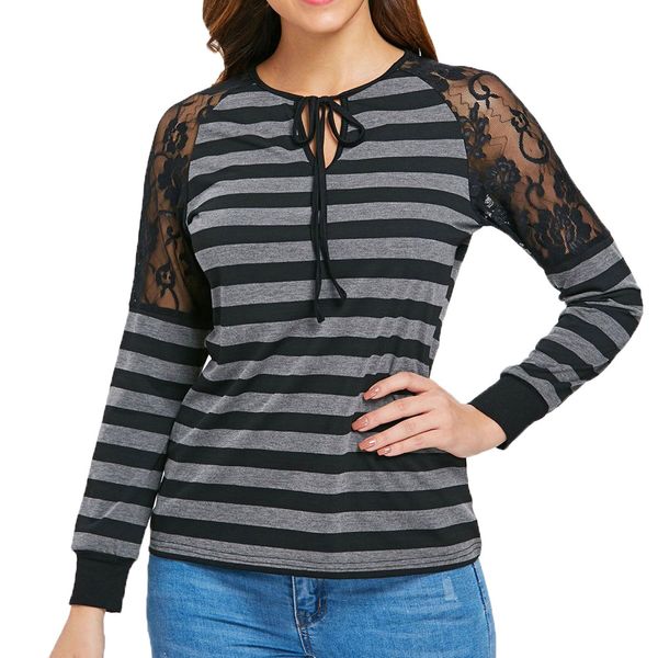 Compre Tops Y Blusas Para Mujer Otono 2018 Remiendo De Encaje Elegante Blusa De Manga Larga A Rayas Mujer Ropa Tunica Senoras Top Feminina A 36 29