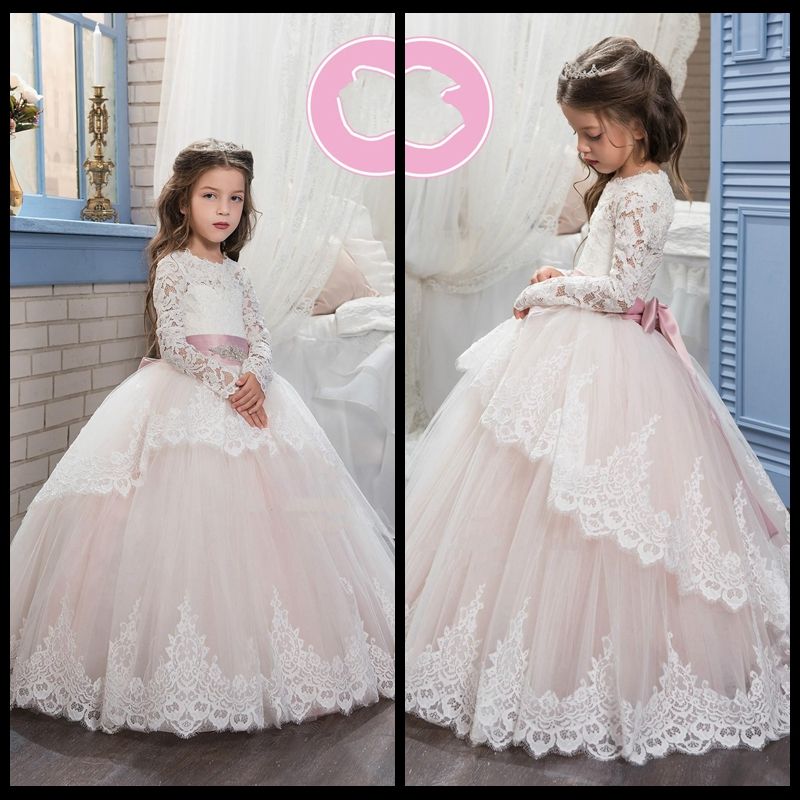 Compre 2018 Nuevo Encaje Mangas Largas Vestidos De Nina De Flores Elegante Princesa Joya Cuello Con Banda Larga Ninos Vestidos Formales Vestidos De